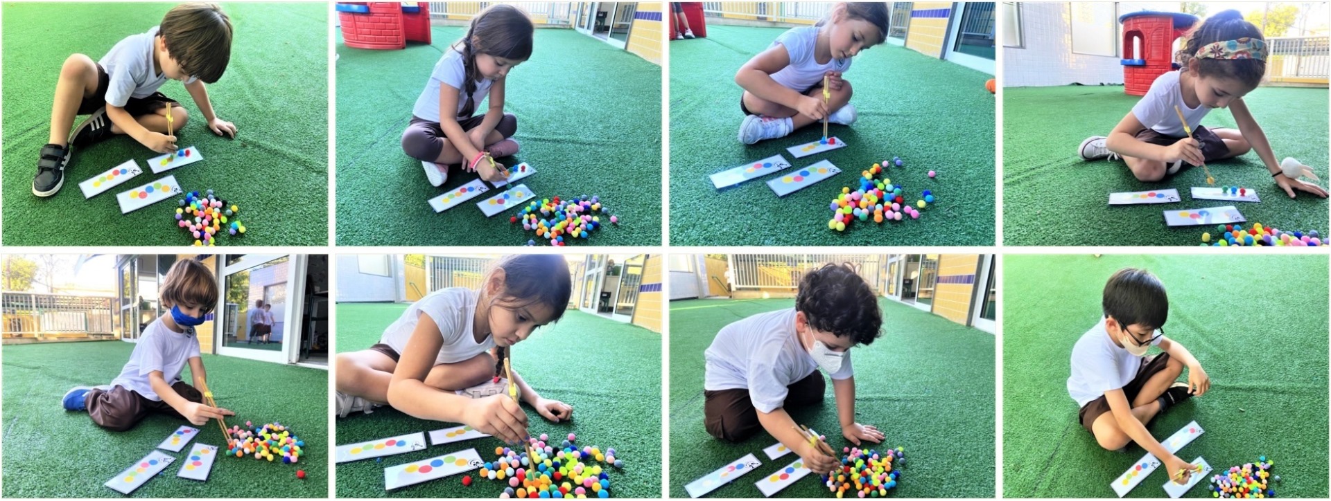 Utilizando bolinhas coloridas e hashi, os alunos do Infantil V C trabalharam os pequenos músculos localizados nas mãos, para movimentos específicos e delicados.